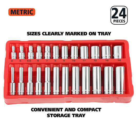 Great Neck 18622 - 22 Pc 1/4 Drive Deep/shallow Socket Set With Tray- Metric