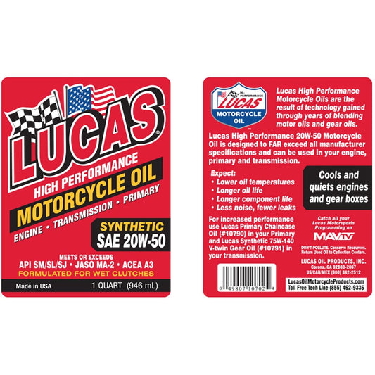 Lucas Oil Synthetic Sae 20w-50 Motorcycle With Moly - 1 Quart