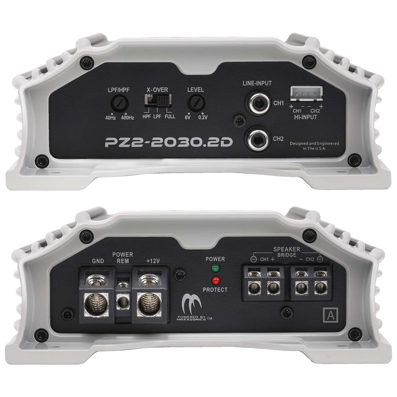&quote;POWERZONE 2&quote; 2 channel amplifier highlighted with aggressive heatsink elements feature high level inputs utilizing SPEED-FET output devices and QTD Technology produces 2000 watts of power in a stereo or bridged mono application.
