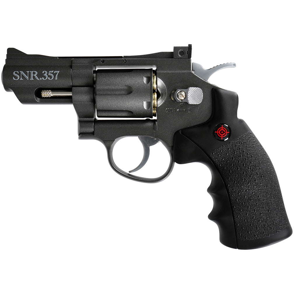 The best air pistol is the one you have with you, or so the saying goes. The new Crosman SNR357 (&quote;SNR&quote; = Snub Nose Revolver) has the heft and feel of a Saturday Night Special with none of the powder. Add dual ammo capabilities and realistic loading with the included reusable cartridges and the backyard becomes the ideal practice range.