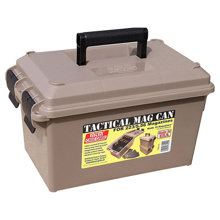 Always ready for quick transport, Tactical Mag Cans offer a protected method of storage for loaded magazines. Each mag is individually secured with ridged precut foam padding to prevent bumping, sliding and scratching. Each box shuts tight with an O-ring seal and solid latching system. Dual latches give better sealing and prevent accidental openings. Security tabbed for three padlocks. Molded-in stacking ridges for slip resistant stacking. Comfortable handle for when you're bugging out. Tactical Gun owners can rest assured knowing their cache is protected inside MTM Mag Cans. Double latched for safety and has 3 padlock tabs.
